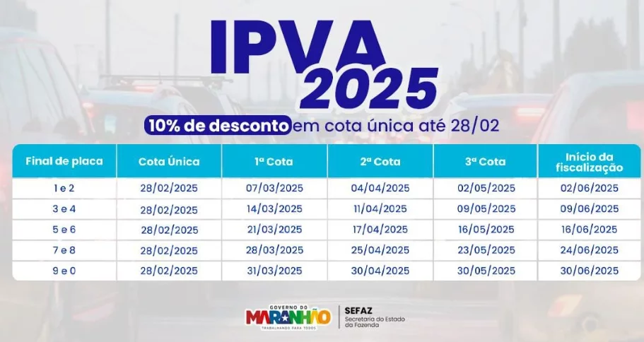 A Secretaria de Estado da Fazenda (Sefaz) lançou os valores do Imposto sobre Propriedade de Veículos Automotores (IPVA) do exercício de 2025 e divulgou o calendário para pagamento do tributo, conforme a Portaria 511/2024, no Maranhão.