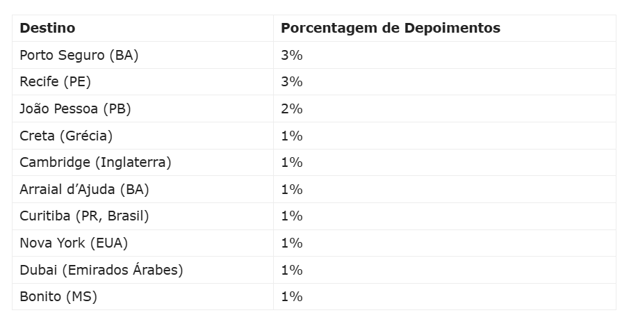 Contudo, entre os destinos internacionais, as buscas se concentram em locais como Creta, na Grécia; Cambridge, na Inglaterra; e Nova York, nos EUA.
