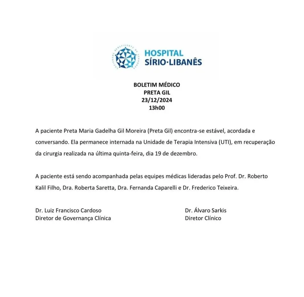 O Hospital Sírio-Libanês, em São Paulo, divulgou no início desta tarde de segunda-feira (23), mais um boletim médico sobre o estado de saúde da cantora Preta Gil. Segundo o documento, a artista se encontra ‘estável’ e ‘acordada’.