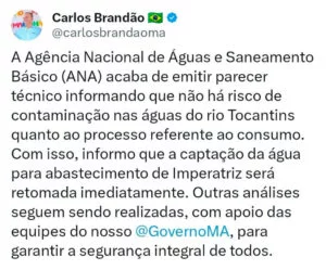 Após receber o laudo da Agência Nacional de Águas e Saneamento Básico (ANA), na tarde desta terça-feira (24), o governador do Maranhão, Carlos Brandão, usou as suas redes sociais para anunciar a retomada da captação do Rio Tocantins., após suspeita de contaminação por produtos químicos, por conta da queda de caminhões após o desabamento de parte da ponte Juscelino Kubitschek, que liga o Maranhão ao estado do Tocantins.