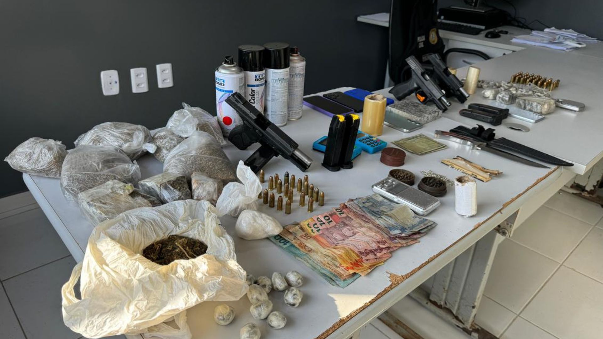 Além das prisões, houve apreensão de porções de maconha, balança de precisão e outros apetrechos utilizados na comercialização de drogas e levando também a atuação em flagrante de um dos presos por tráfico de drogas. Além disso, também foram apreendidos celulares, câmeras que faziam a segurança de um dos locais, uma arma de fogo, um simulacro e armas brancas.