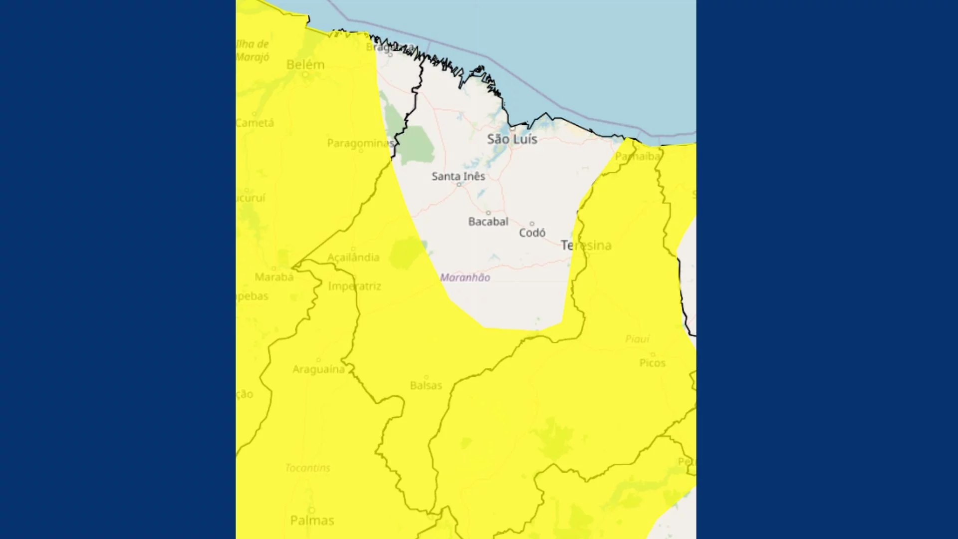 Já o alerta amarelo de perigo potencial, foi emitido para 69 municípios ao centro sul do estado, entre eles, Alto Parnaíba, Balsas, Carolina, Estreito, Fernando Falcão, Fortaleza dos Nogueiras, Imperatriz, Mirador, Pastos Bons, São Bernardo, São Raimundo das Mangabeiras e em Timon.