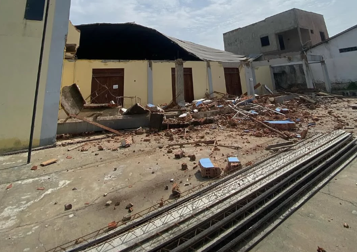 Segundo informações, a laje da frente caiu e parte do telhado metálico cedeu.
