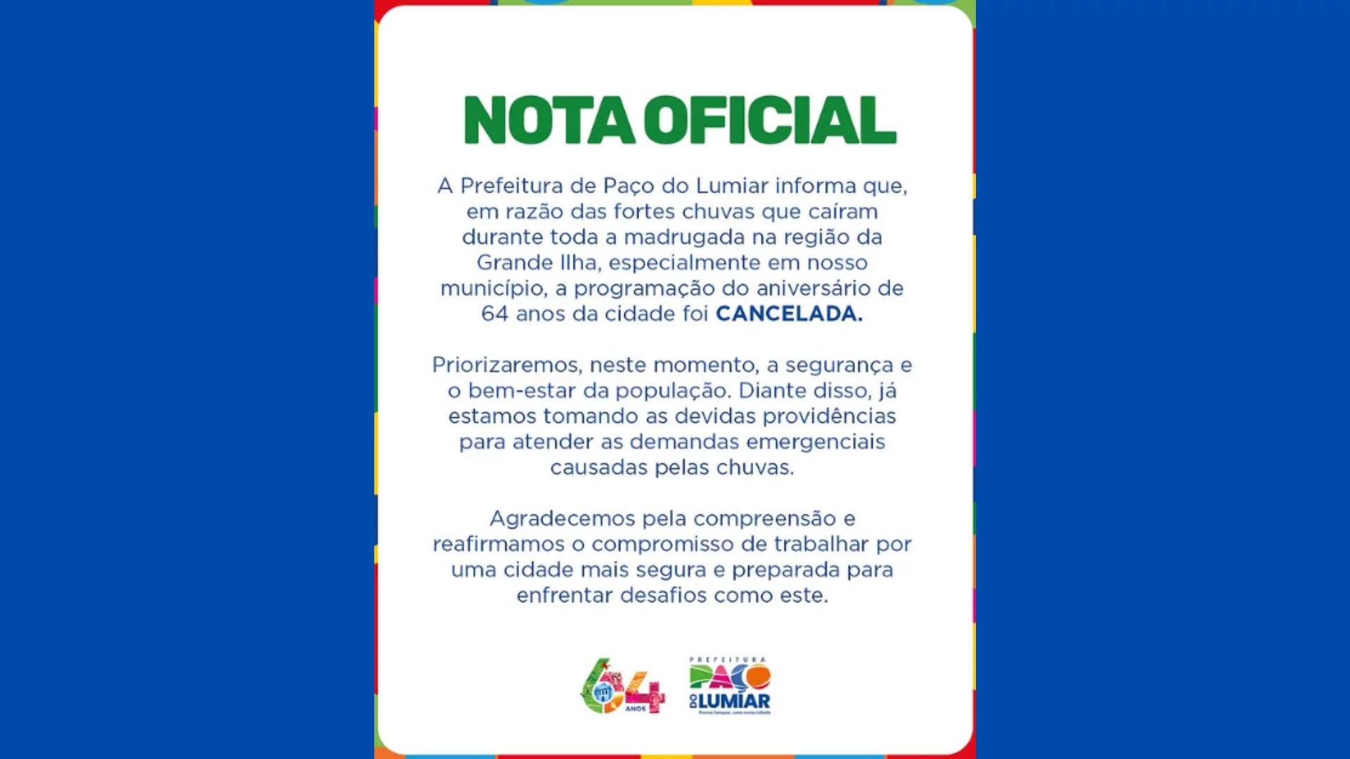 Prefeito de Paço do Lumiar cancela programação após fortes chuvas
