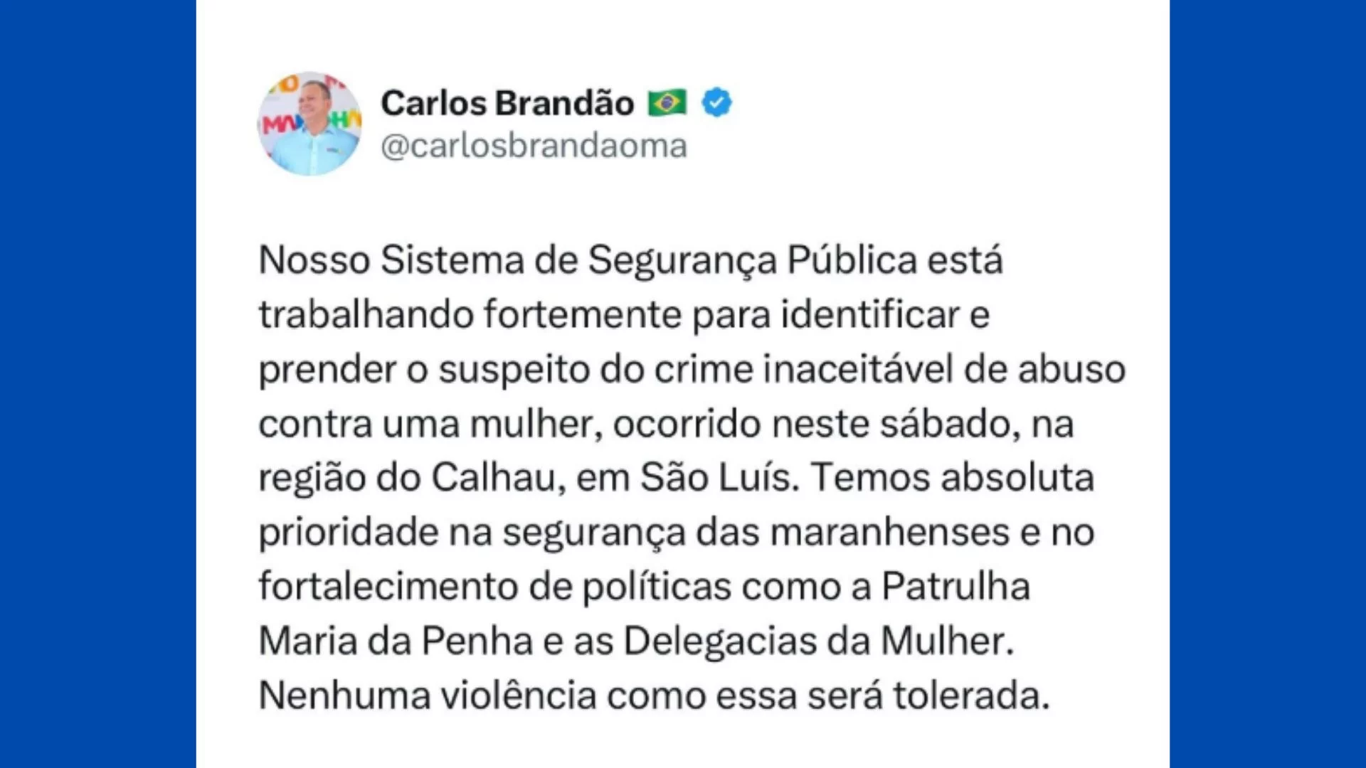 O caso ganhou repercussão nas redes sociais nesse fim de semana. O governador do Maranhão, Carlos Brandão, informou que o Sistema de Segurança Pública está trabalhando para identificar e prender o criminoso.