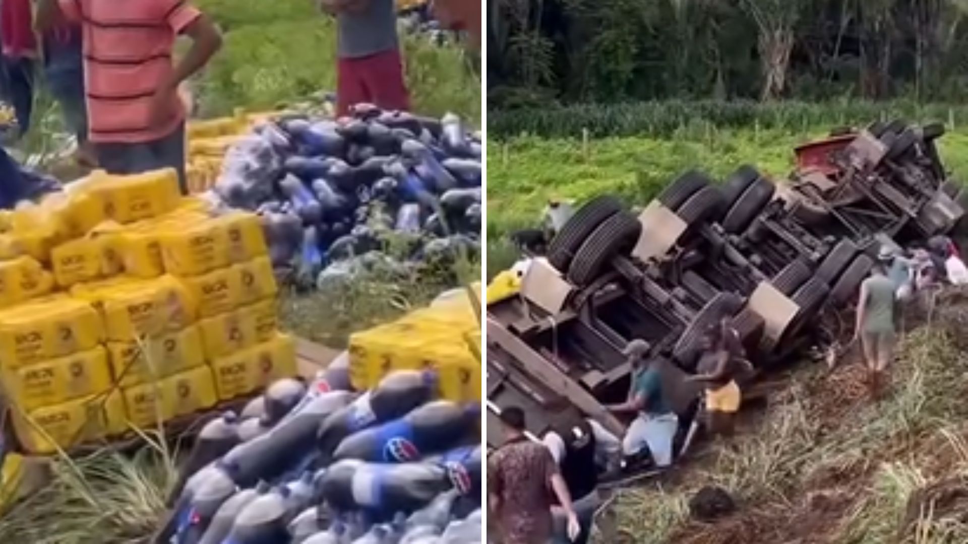 Vídeos compartilhados nas redes sociais mostram o veículo tombado à margem da rodovia, enquanto dezenas de moradores saqueavam a carga.