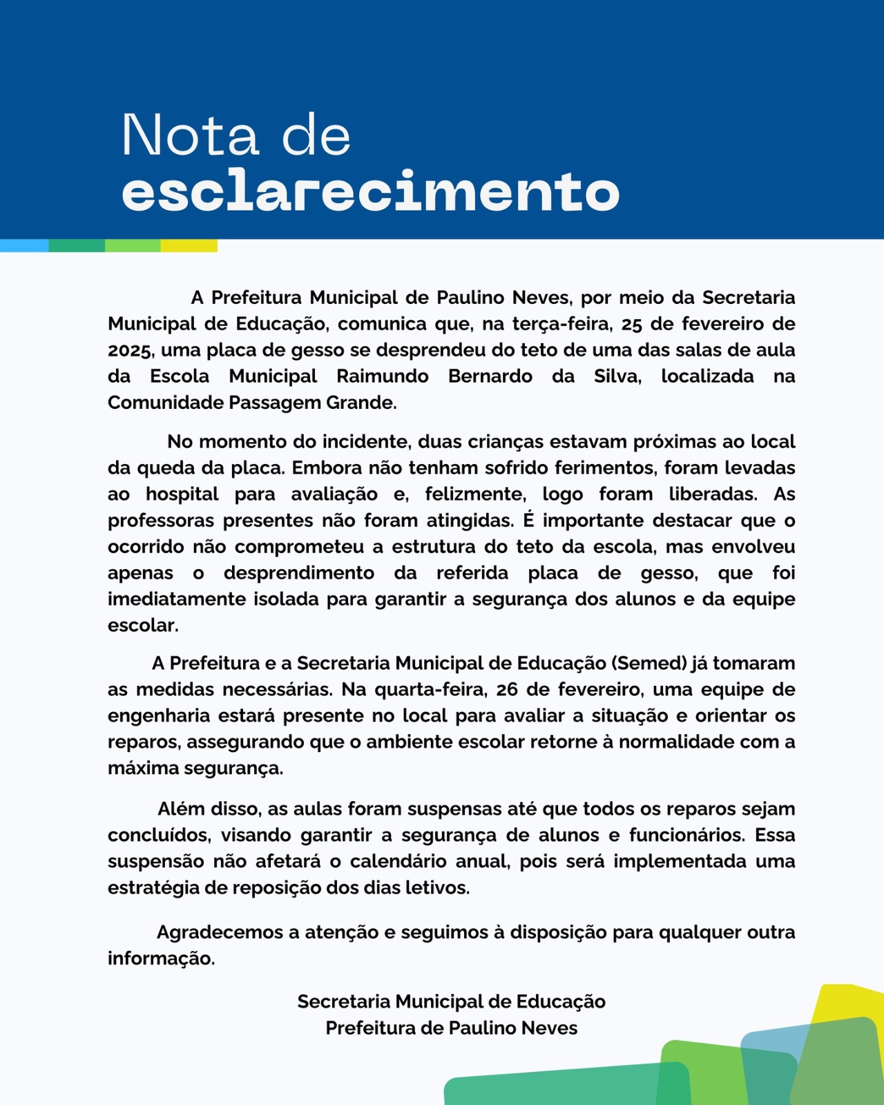 Ainda segundo a nota, o registro não comprometeu a estrutura do teto da escola, envolvendo apenas o desprendimento da referida placa de gesso, que foi imediatamente isolada.