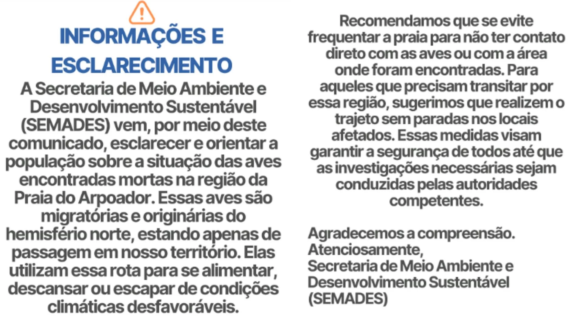 Em nota, a Secretaria de Meio Ambiente e Desenvolvimento Sustentável recomenda “que se evite frequentar a praia para não ter contato direto com as aves ou com a área onde foram encontradas. Para aqueles que precisam transitar por essa região, sugerimos que realizem o trajeto sem paradas nos locais afetados. Essas medidas visam garantir a segurança de todos até que as investigações necessárias sejam conduzidas pelas autoridades competentes”.