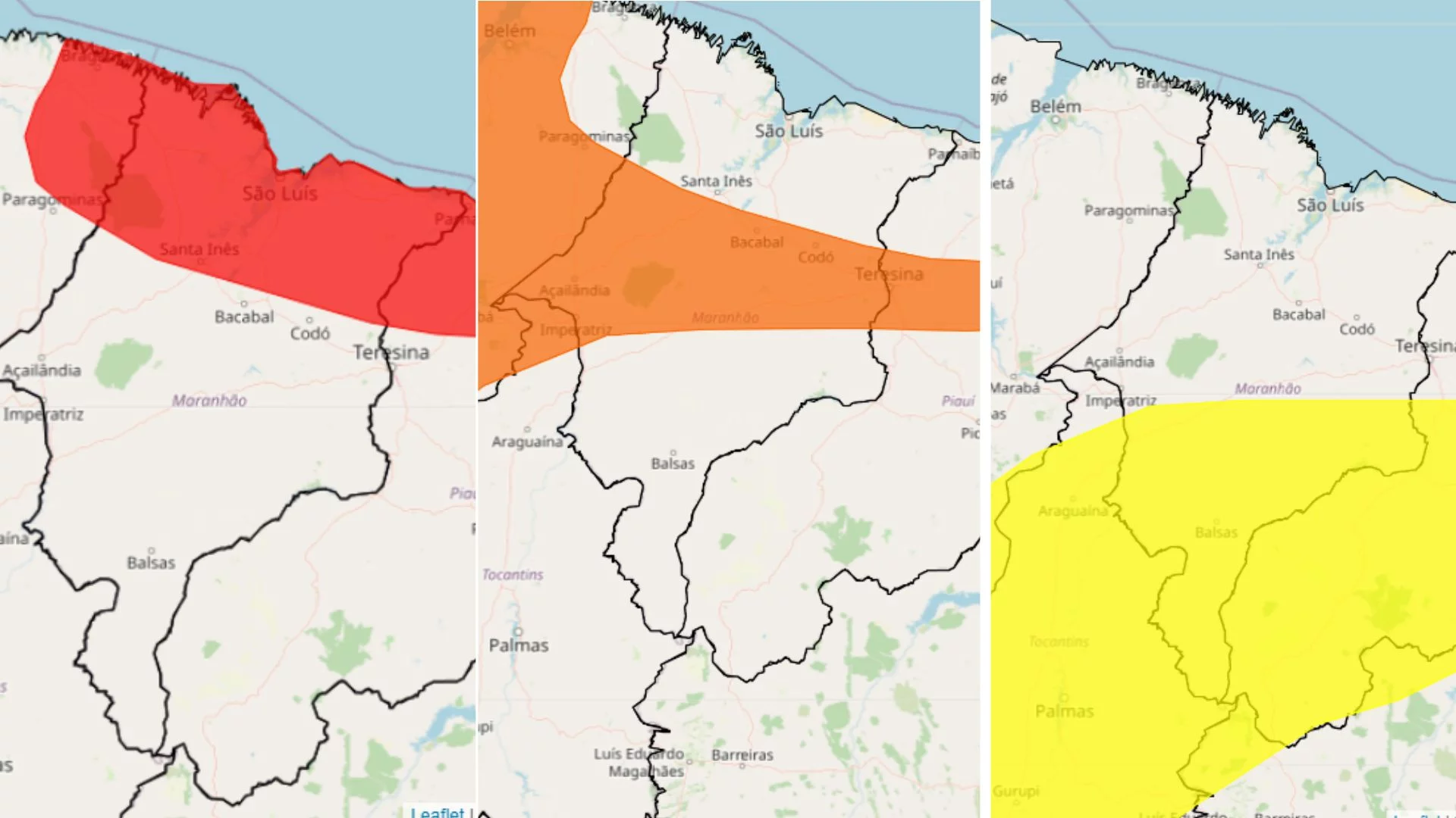 Já o alerta amarelo atinge 48 cidades ao centro sul do estado, como Alto Parnaíba, Colinas, Estreito, Mirador e São Raimundo das Mangabeiras.