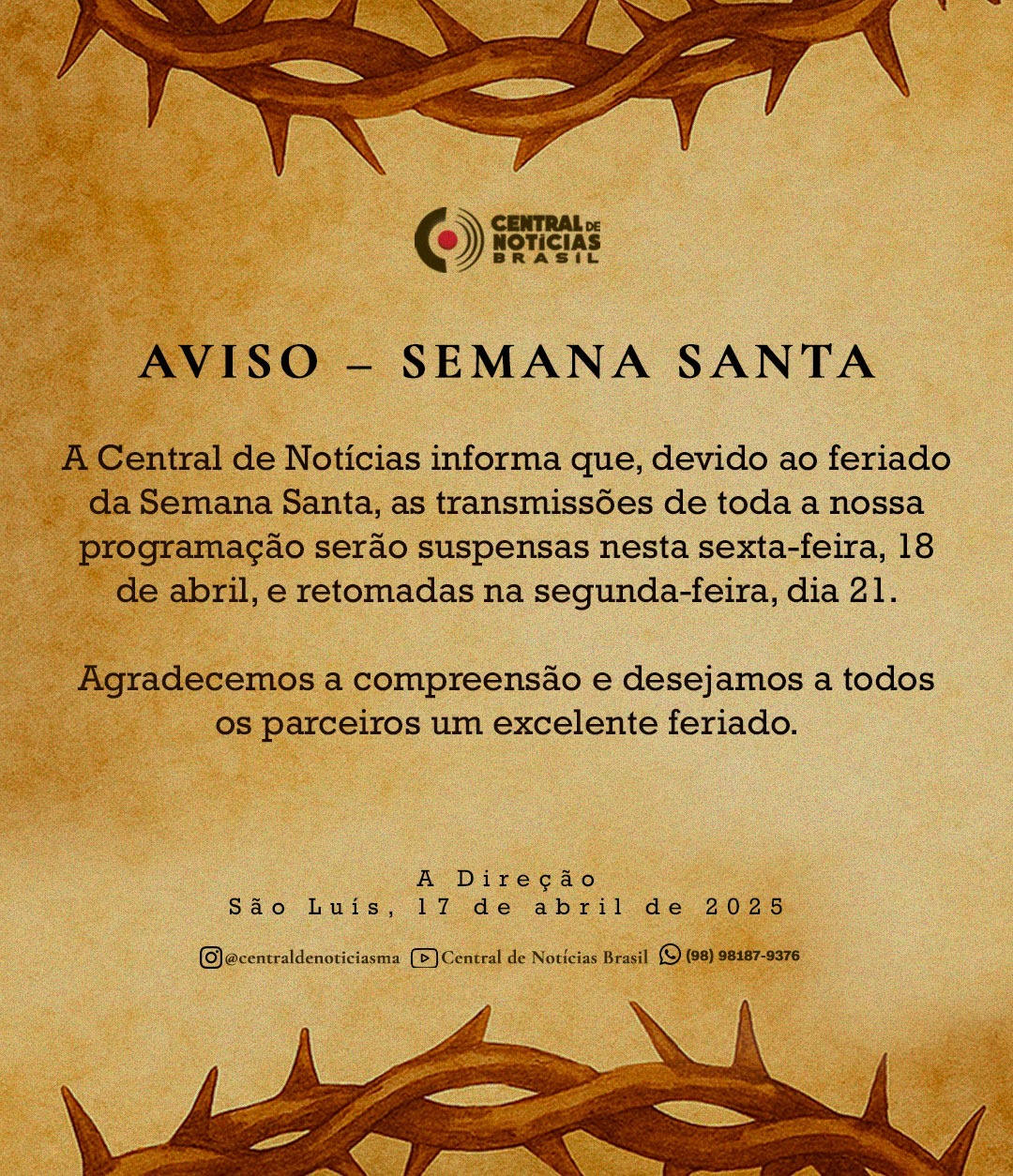 CIDADES AVISO – FERIADO DE PÁSCOA Por Teresa Cristina 17 de abril de 2025 às 18:11 1 min de leitura 0 visualizações Compartilhar: Tags: CNB Teresa Cristina ← Anterior Bruno Lobo e Socorro Reis treinam para a disputa da Fórmula Kite Próximo → Suspeita de envenenar três pessoas da mesma família é presa tentando fugir da cidade 📰 Matérias Relacionadas DESTAQUES VÍDEO: Jovem sofre tentativa de homicídio em oficina 2 meses atrás DESTAQUES Ministro da Educação inaugura escola em Açailândia 2 meses atrás CIDADES VÍDEO: Maranhão chega a 182 restaurantes populares com refeições a partir de R$ 0,50 11 meses atrás 💬 Comentários (0) Deixe um Comentário Cancelar RespostaO seu endereço de e-mail não será publicado. Campos obrigatórios são marcados com *Comentário*Nome* Email* Salvar meus dados neste navegador para a próxima vez que eu comentar. Δ Este site utiliza o Akismet para reduzir spam. Saiba como seus dados em comentários são processados.