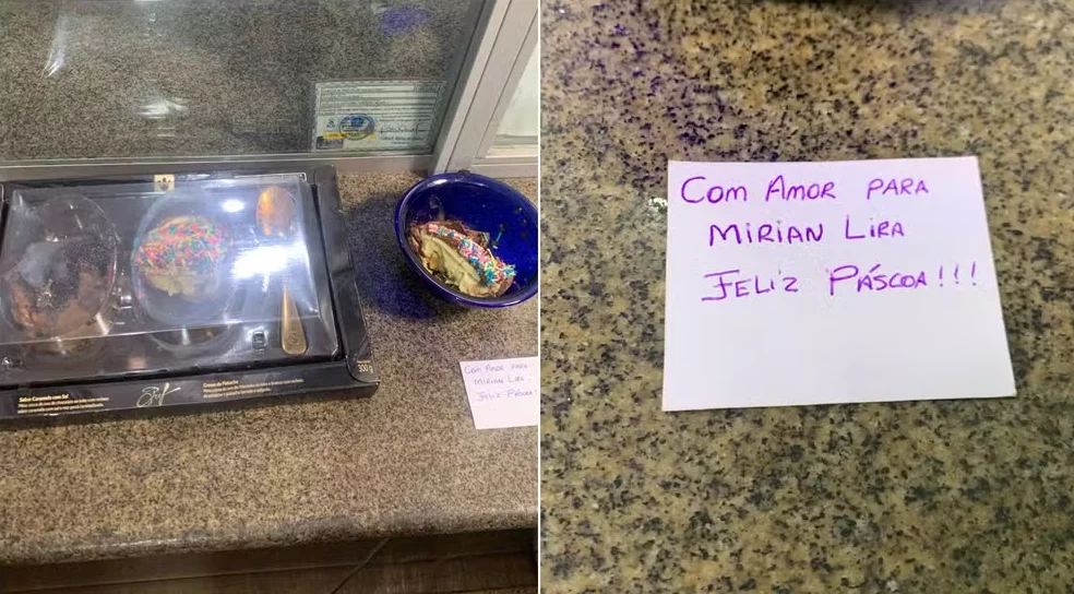 Conforme o depoimento do pai da criança, o ovo chegou à casa da família entregue por um motoboy, como um presente, na noite de quarta-feira (16/4). O doce veio acompanhado de um bilhete escrito: “Com amor, para Miriam Lira. Feliz Páscoa”.