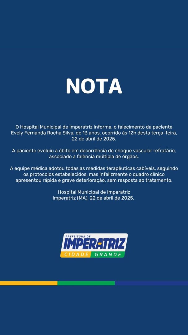 Morreu na tarde desta terça-feira (22) Evely Fernanda Rocha Silva, de 13 anos, em decorrência de choque vascular refratário, associado à falência múltipla de órgãos, após complicações em seu quadro de saúde. Evely estava internada em estado grave no Hospital Municipal de Imperatriz após comer um ovo de páscoa envenenado.