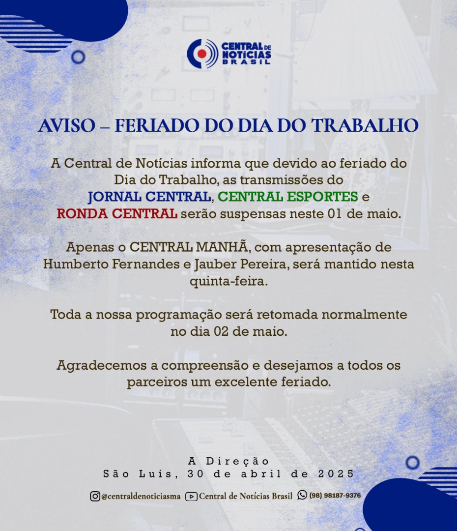 CIDADES AVISO – FERIADO DO DIA DO TRABALHO Por Teresa Cristina 01 de maio de 2025 às 08:12 1 min de leitura 0 visualizações Compartilhar: Tags: programação Teresa Cristina ← Anterior Brasil registrou 71,5 mil postos formais de trabalho em março Próximo → Sampaio e Maranhão vencem no primeiro confronto da semifinal 📰 Matérias Relacionadas DESTAQUES Operação “Aulas Seguras” reforça segurança na compra de materiais escolares 11 meses atrás CIDADES IFMA abre concurso com vagas para professores e técnicos 4 meses atrás CIDADES Itaguatins sedia neste final de semana edição especial do Esporte Verão 2025 4 meses atrás 💬 Comentários (0) Deixe um Comentário Cancelar RespostaO seu endereço de e-mail não será publicado. Campos obrigatórios são marcados com *Comentário*Nome* Email* Salvar meus dados neste navegador para a próxima vez que eu comentar. Δ Este site utiliza o Akismet para reduzir spam. Saiba como seus dados em comentários são processados.