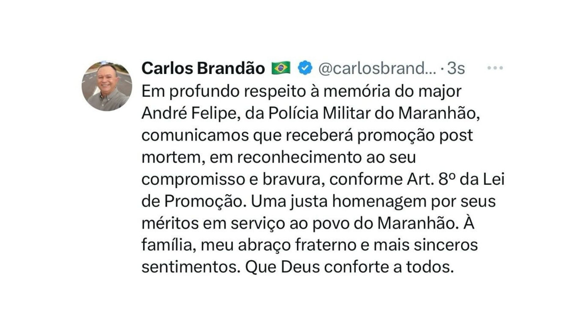 O governador do Maranhão, Carlos Brandão, concederá post mortem ao major da PM André Felipe dos Santos de Carvalho, assassinado nessa quarta-feira (30) em um posto de combustível, no bairro São Francisco, em São Luís. A informação foi dada pelas redes sociais.