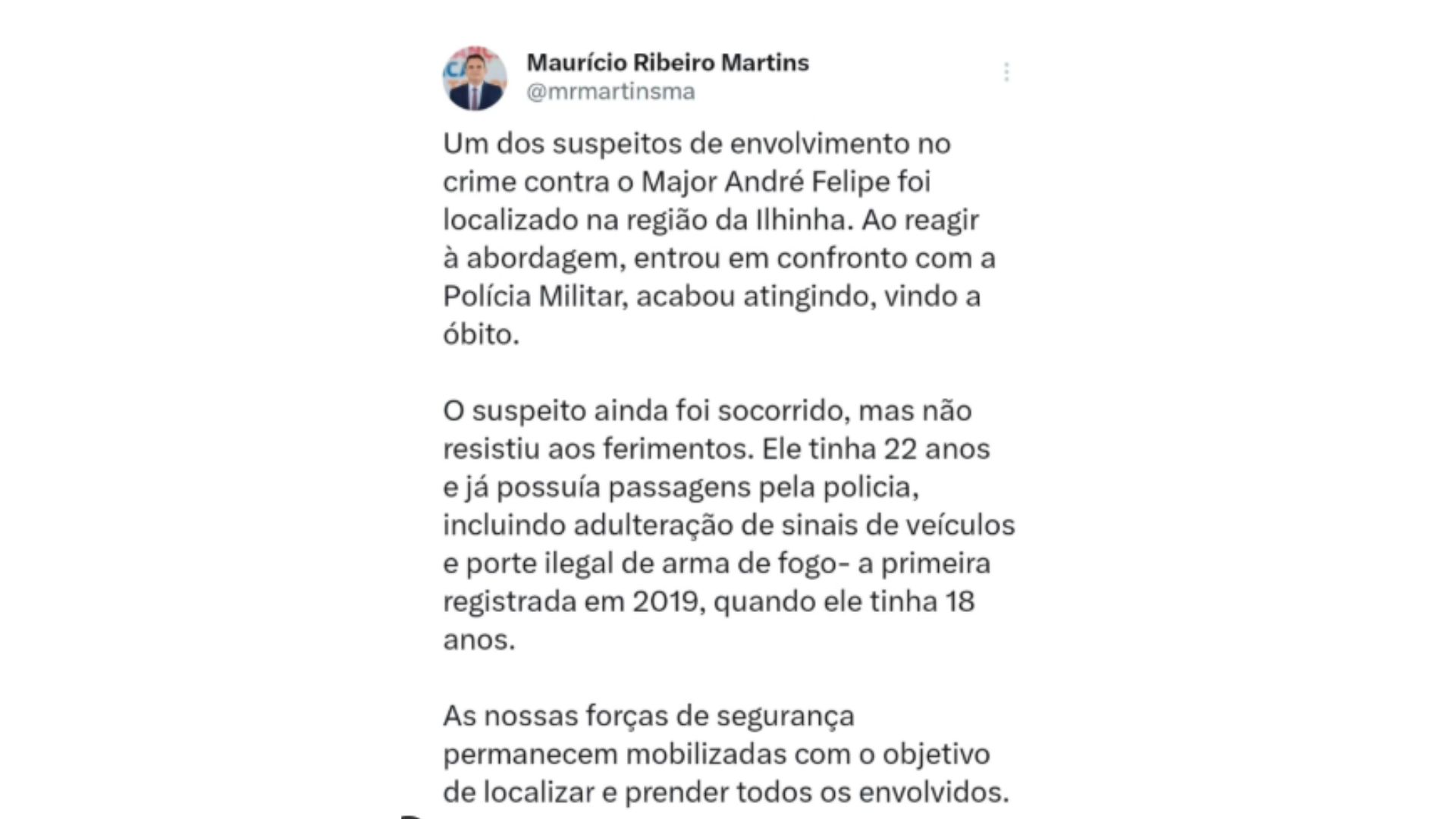 Em nota, a Secretaria de Estado da Segurança Pública do Maranhão (SSP-MA)informou que Ailton Silva Júnior, de 22 anos, já tinha passagens pela polícia pelos crimes de adulteração de sinais de veículos e porte ilegal de arma de fogo, sendo que a primeira ocorrência foi registrada em 2019, quando ele tinha 18 anos.