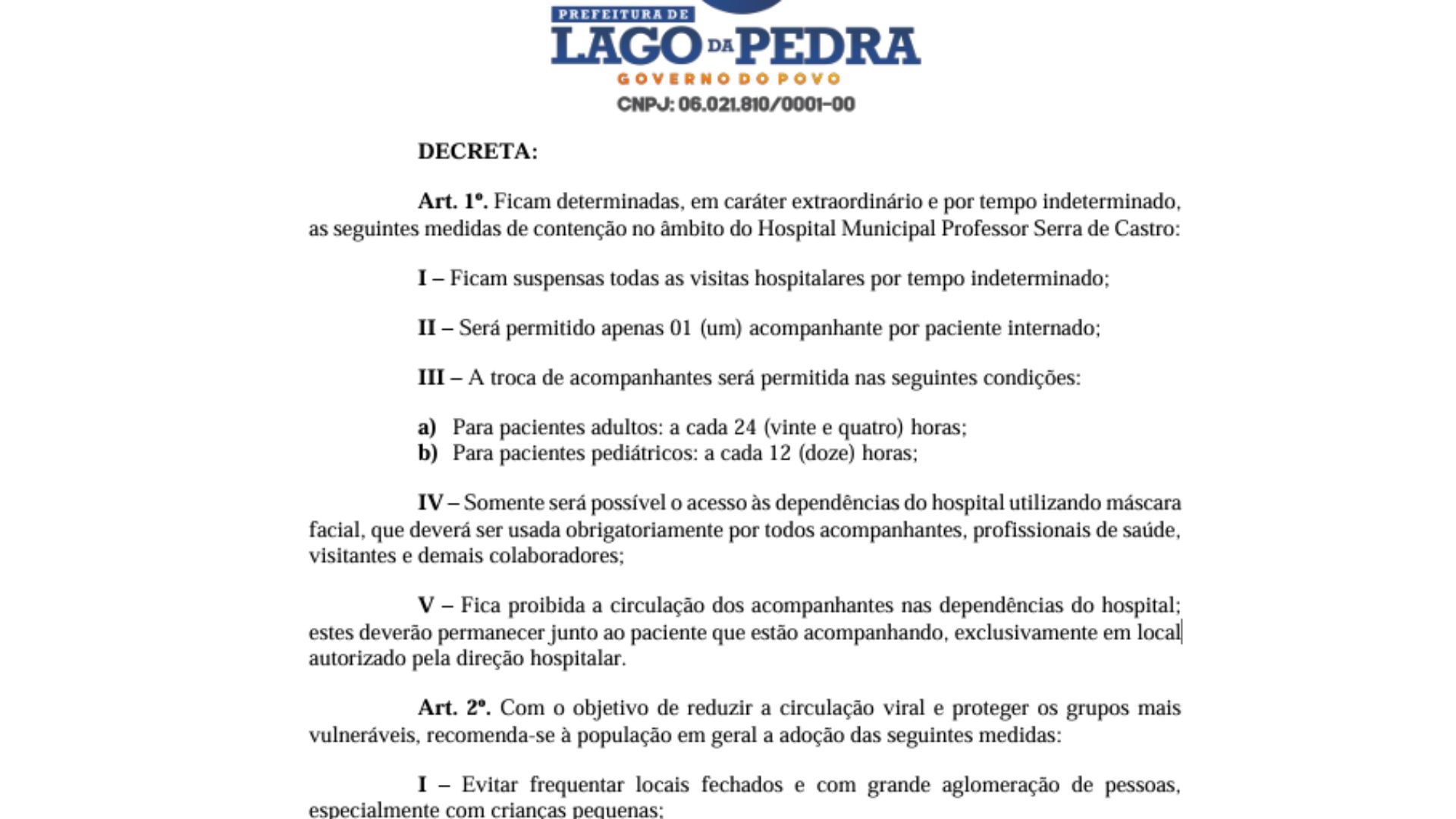 Em Lago da Pedra, a Prefeitura suspendeu por tempo indeterminado visitas no Hospital Municipal Professor Serra de Castro devido o aumento dos casos de síndromes respiratórias.