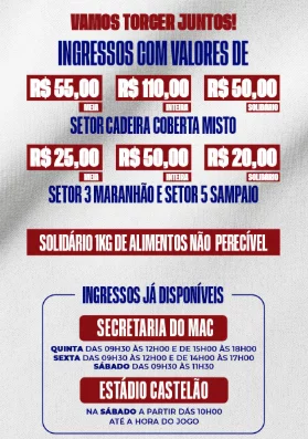 Na manhã desta quinta-feira (26), a diretoria do Maranhão Atlético Clube iniciou a venda dos ingresso para o clássico Samará, no próximo sábado (28). Os valores são de R$ 110,00 para as cadeiras cobertas, sendo, R$ 55,00 para a maia entrada e R$ 50, 00 para a modalidade de ingressos solidário. Já para as arquibancadas, o valor é de R$ 50, 00 com 25 para a maia e R$ 20 para os ingressos solidário. No Momento, as vendas acontecem somente na secretaria do clube, que fica no parque Valério Monteiro, na região da Cohama, em São Luís. No dia do jogo, deve acontecer também nas bilheterias do estádio Castelão, palco da partida.