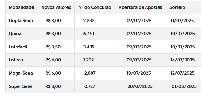 As apostas das Loterias Caixa aumentam a partir de 9 de julho. O reajuste atinge as modalidades Dupla Sena, Quina, Lotofácil, Mega-Sena, Loteca e Super Sete.