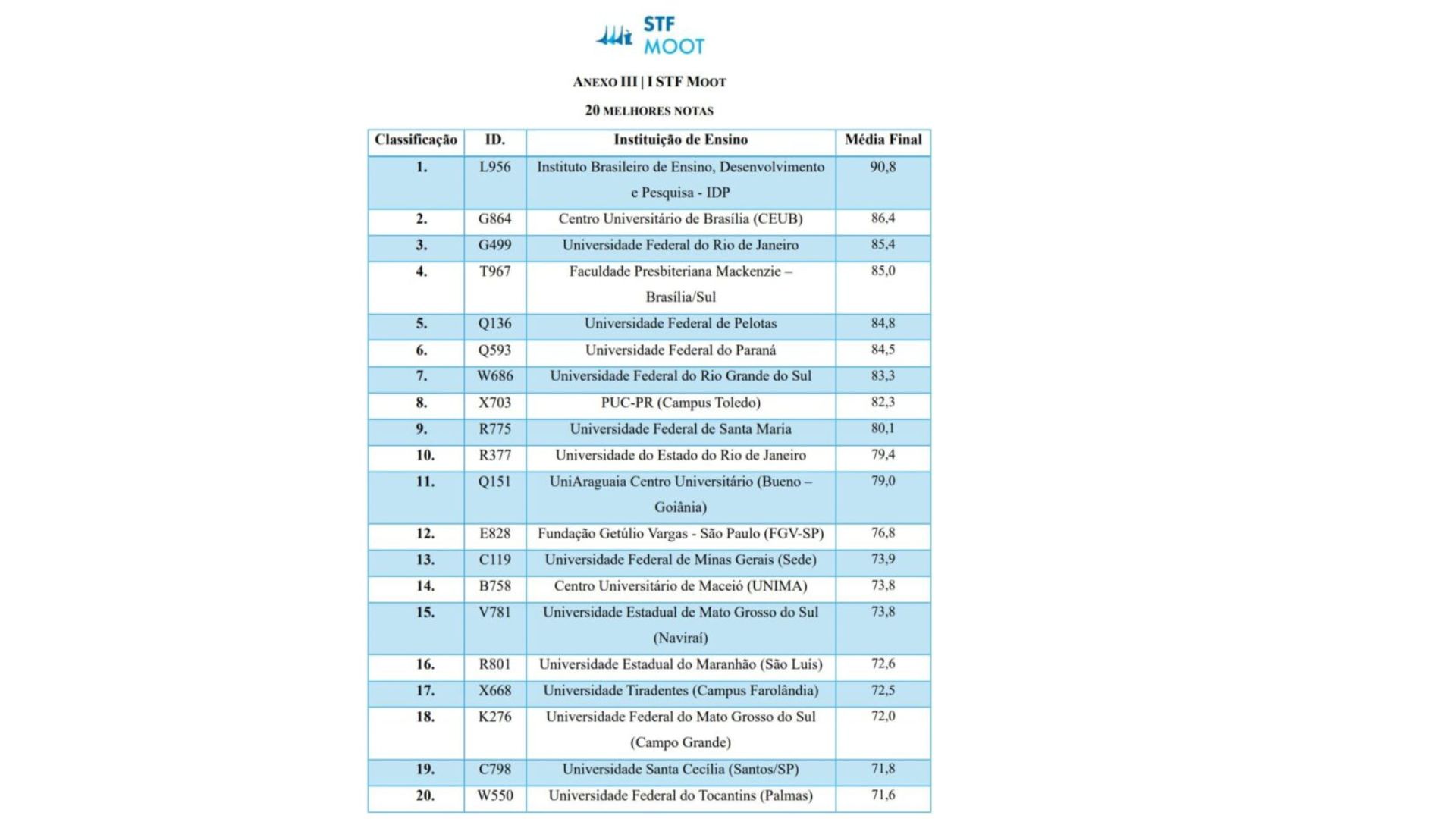 A Universidade Estadual do Maranhão (Uema) conquistou uma das melhores colocações do país na primeira edição do STF Moot, competição nacional de julgamento simulado promovida pelo Supremo Tribunal Federal (STF). A equipe do curso de Direito do Campus São Luís ficou na 16ª posição entre 343 instituições de ensino superior de todo o Brasil.