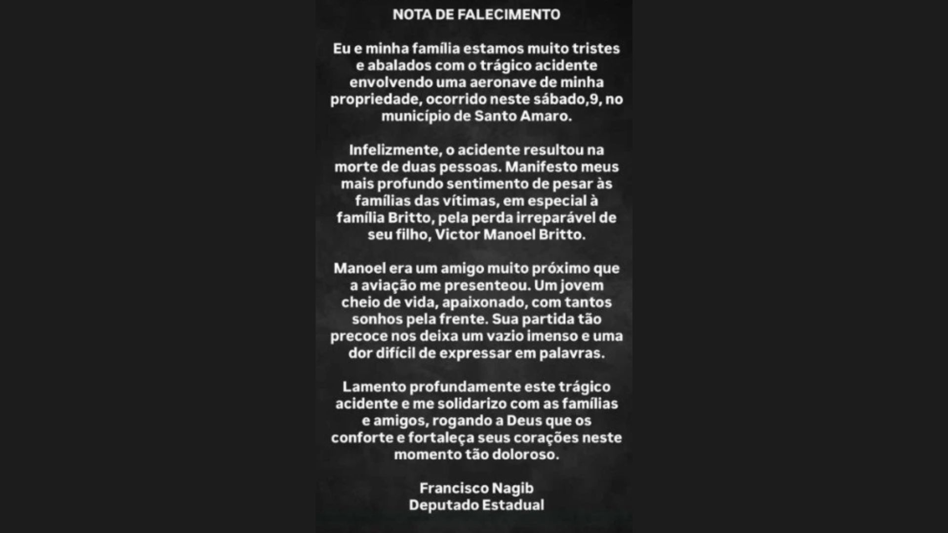 Um dos ocupantes foi identificado como Victor Manoel Britto, que pilotava o avião no momento do acidente. Nagib lamentou a partida de Manoel, chamando-o de “jovem cheio de vida, apaixonado, com tantos sonhos pela frente” e “um amigo muito próximo que a aviação me presenteou”.