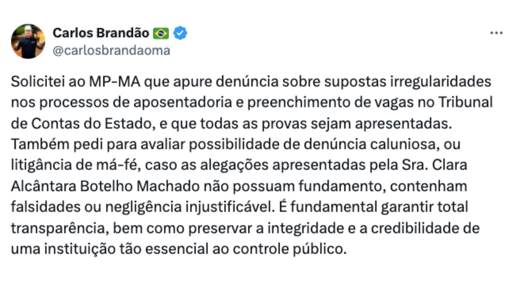 Além do STF, Brandão solicitou ao Ministério Público Estadual (MP-MA) a apuração de denúncias sobre supostas irregularidades nos processos de aposentadoria e no preenchimento de vagas no TCE-MA, incluindo suspeitas nas aposentadorias dos conselheiros Washington Oliveira e Álvaro de França Ferreira, com alegações de venda de vagas. O governador reforçou que todas as provas devem ser apresentadas e pediu também a análise de eventual denúncia caluniosa ou litigância de má-fé.