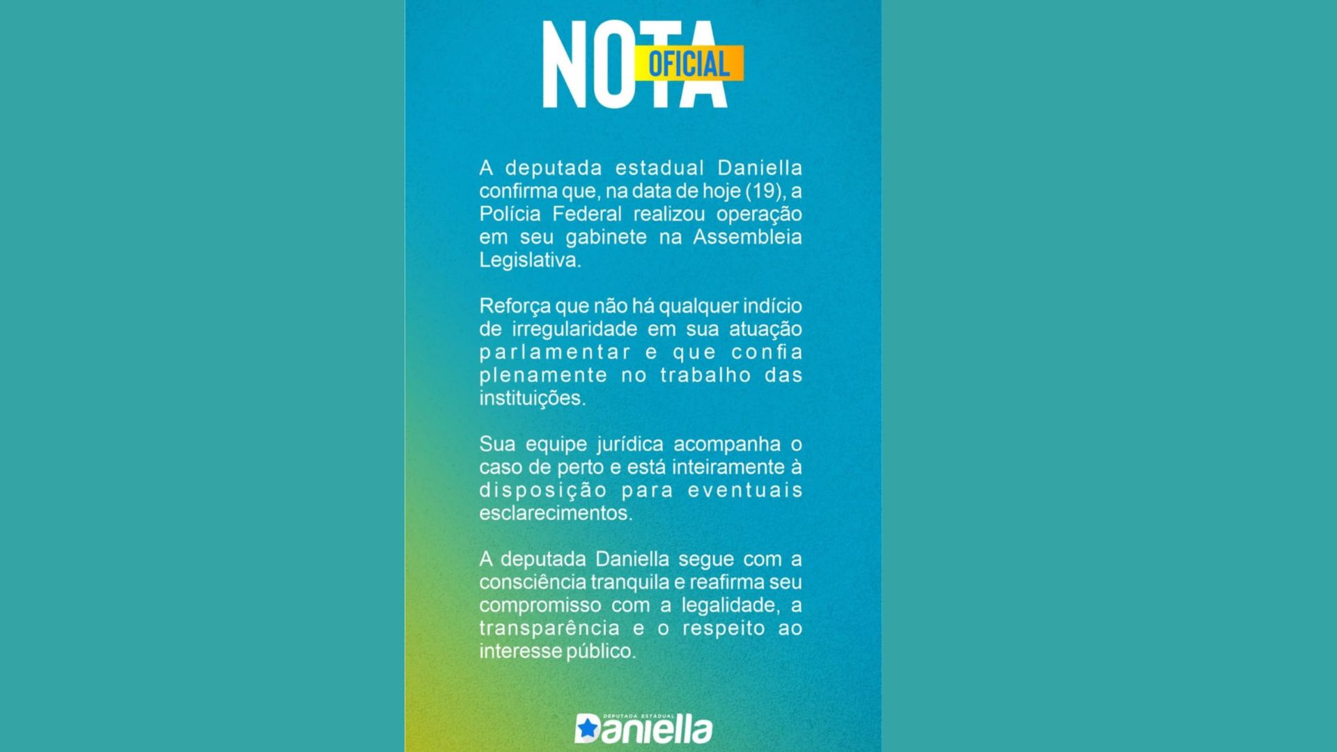 A deputada estadual Daniella (PSB) confirmou que agentes da polícia federal estiveram em seu gabinete na Assembleia Legislativa do Maranhão, cumprindo mandados de busca e apreensão, nesta terça-feira (19), mas negou qualquer irregularidade em sua atuação.