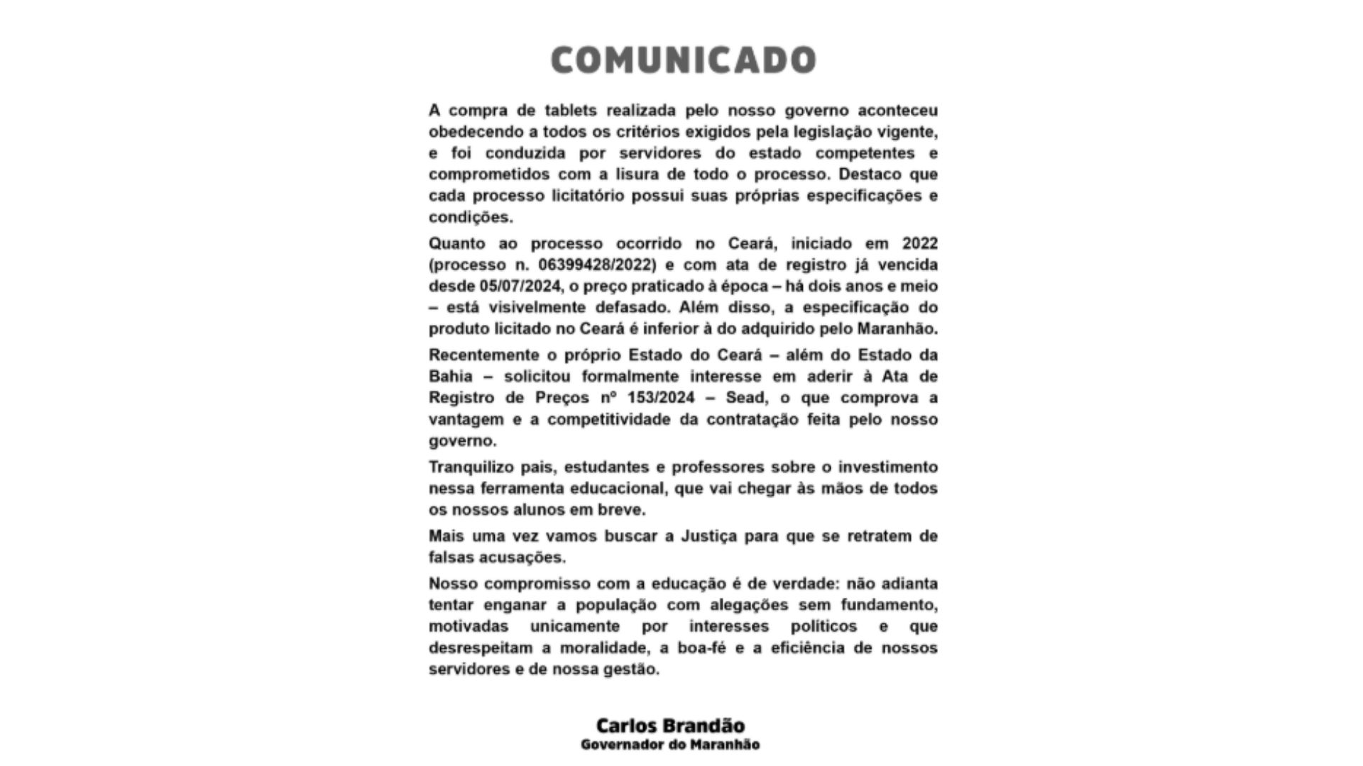 O governador do Maranhão, Carlos Brandão, usou as redes sociais para esclarecer a aquisição de tablets a estudantes das escolas públicas do Maranhão e investimento na educação.