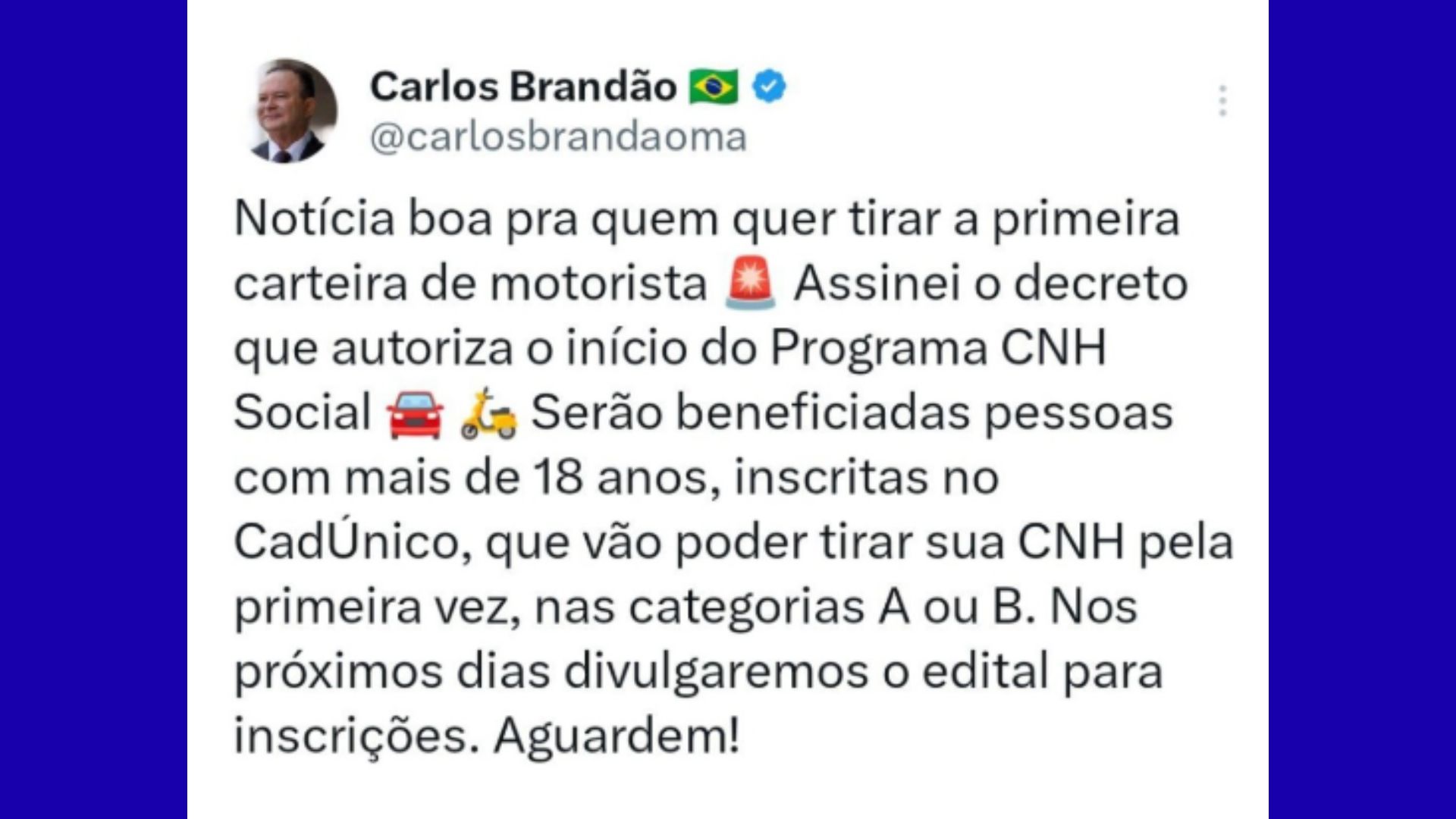 O governador do Maranhão, Carlos Brandão, assinou o decreto que autoriza o início do Programa CNH Social. O programa possibilita o acesso gratuito à primeira Carteira Nacional de habilitação – CNH, nas categorias A ou B para famílias de baixa renda e inscritas no Cadúnico. A notícia foi compartilhada pelo governador nas redes sociais.