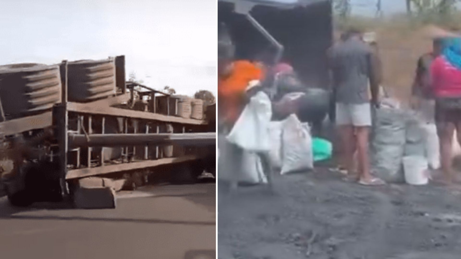 Imagens divulgadas nas redes sociais mostram várias pessoas carregando sacos do material espalhado na rodovia.