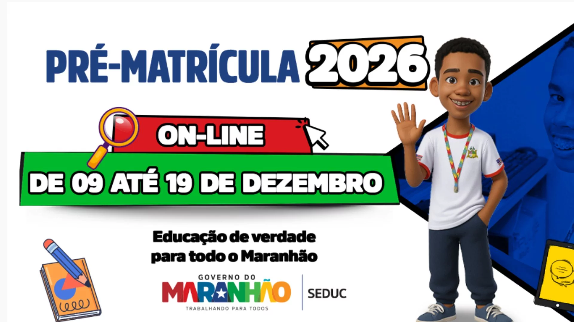 A Secretaria de Estado da Educação abriu, nesta terça-feira (9), o período de pré-matrícula para novos estudantes que desejam ingressar na Rede Pública Estadual do Maranhão em 2026; o procedimento é totalmente on-line e exige Cadastro Antecipado, abrangendo vagas do Ensino Fundamental ao Médio, modalidades integrais, Iema Bilíngue e creches.
