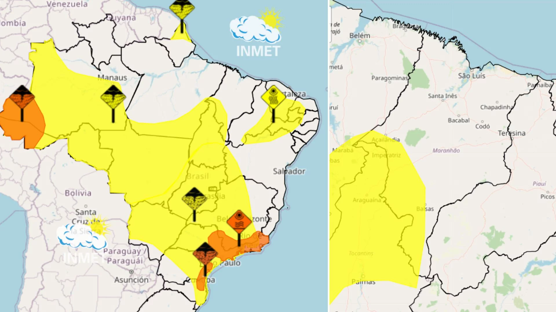 O alerta atinge 31 municípios maranhenses, entre eles Açailândia, Balsas, Imperatriz, Carolina, Grajaú, Porto Franco, Estreito e Riachão, além de outras cidades da região Sul e Oeste do estado.