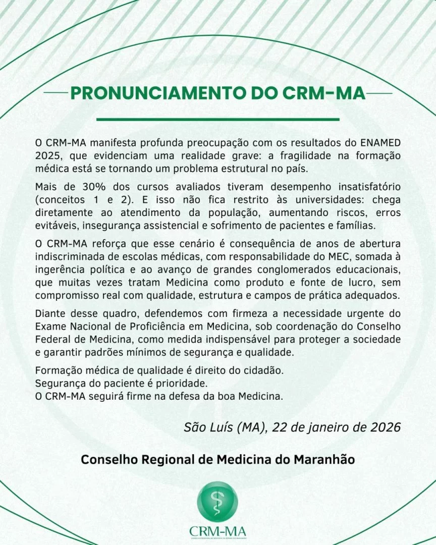 O CRM-MA vê com preocupação os resultados e diz que o desempenho insatisfatório “não fica restrito às universidades: chega diretamente ao atendimento da população, aumentando riscos, erros evitáveis, insegurança assistencial e sofrimentos de pacientes e famílias”.