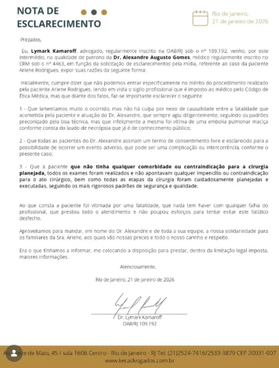 A nota assinada pelo advogado Lymark Kamaroff, inscrito na OAB/RJ nº 109.192, informa que Ariene não tinha comorbidades nem contraindicação para a cirurgia. Segundo a nota, todos os exames foram realizados e não indicavam impedimento para o ato cirúrgico, e as etapas do procedimento teriam sido “cuidadosamente planejadas e executadas”, seguindo “rigorosos padrões de segurança e qualidade”.