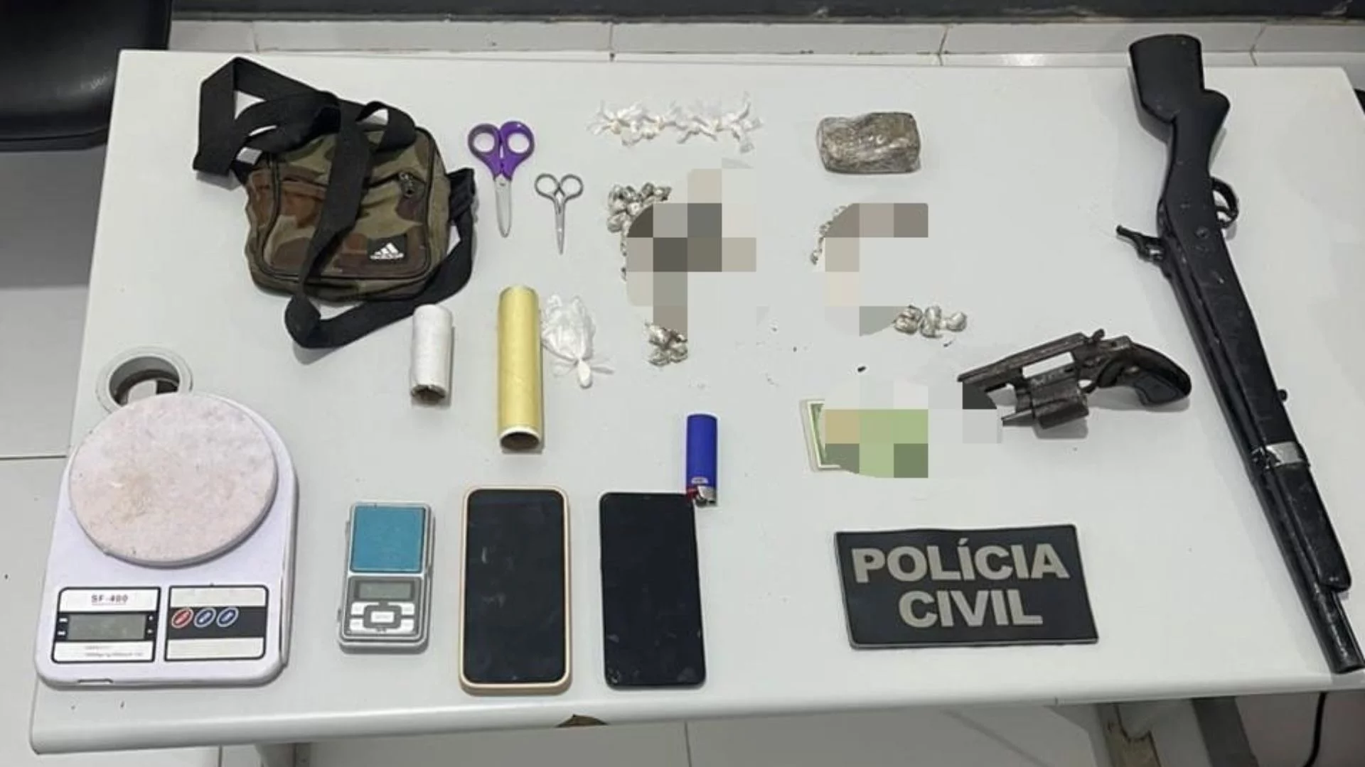 Durante as buscas, foram apreendidos entorpecentes análogos à maconha e ao crack, um revólver calibre .38, uma arma artesanal conhecida como “bate-bucha”, além de balanças de precisão, munições e materiais utilizados no tráfico de drogas.