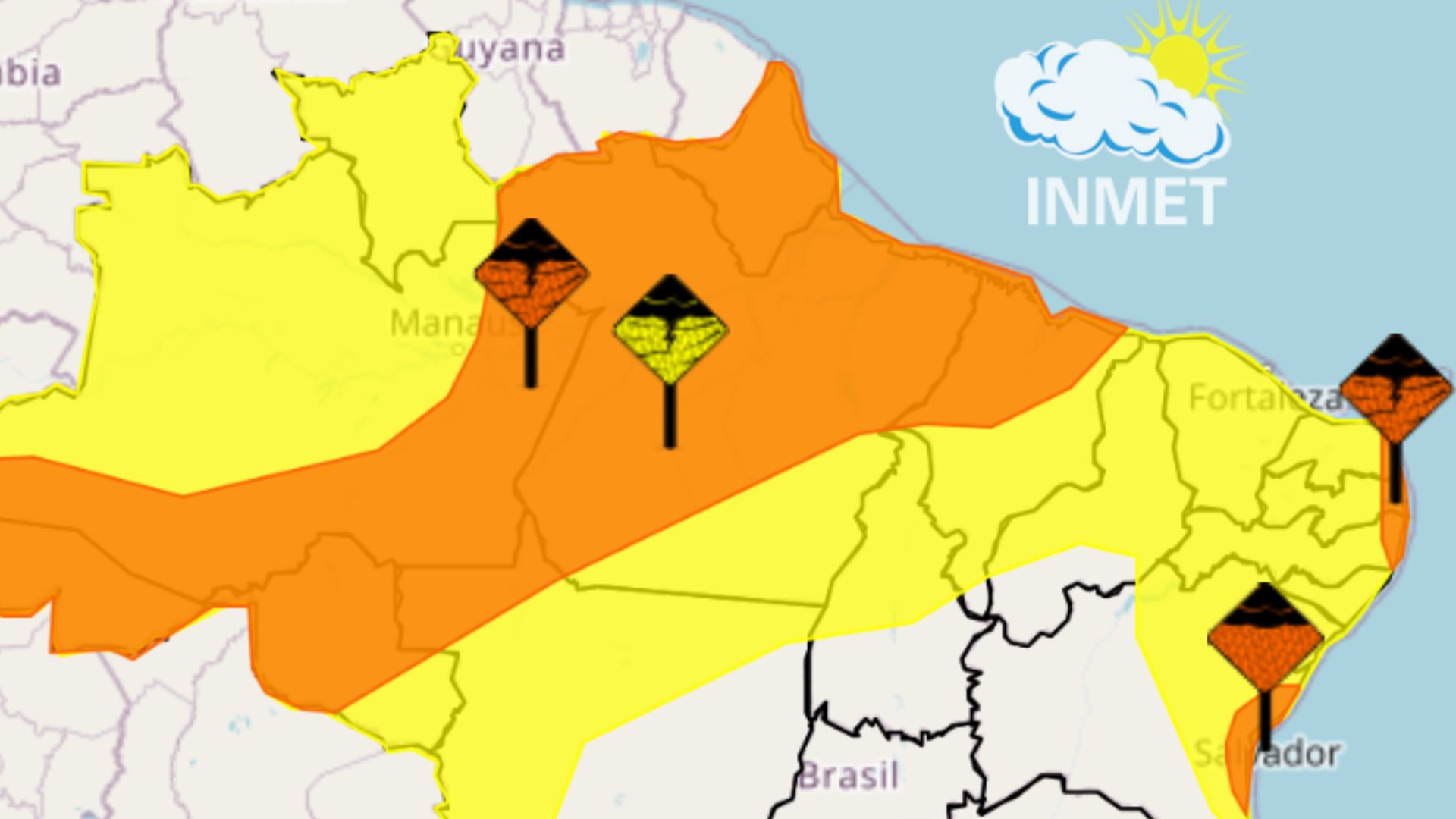Abrange todo o Maranhão (217 municípios), com previsão de chuvas moderadas e possibilidade de ocorrências pontuais, como queda de galhos e alagamentos.