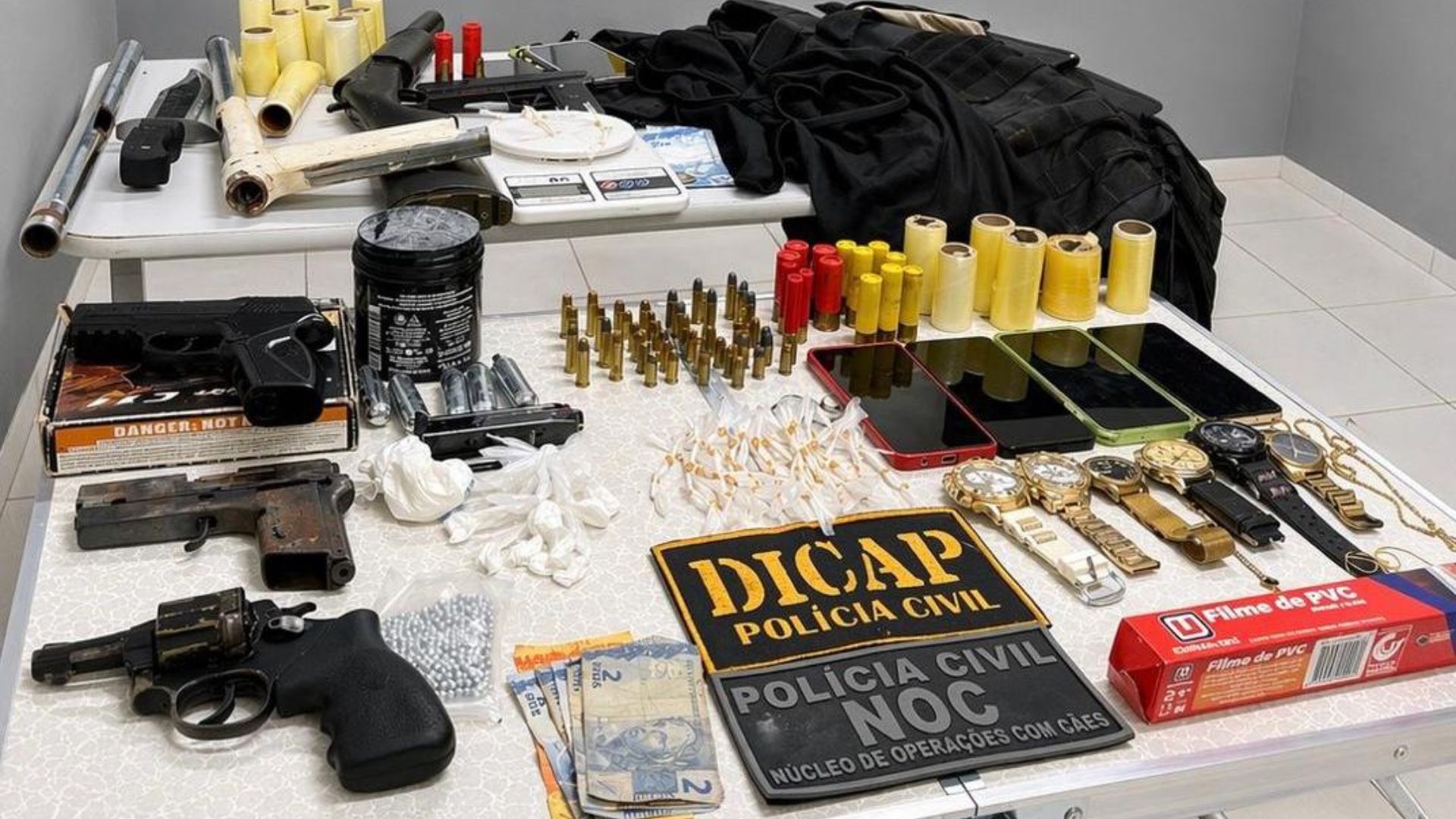 Na ação, os policiais também encontraram armas de fogo, incluindo um revólver calibre .38, uma espingarda calibre 12, outras armas artesanais e simulacros, além de coletes táticos, tocas tipo “ninja”, celulares e objetos com suspeita de origem ilícita, como joias e relógios.