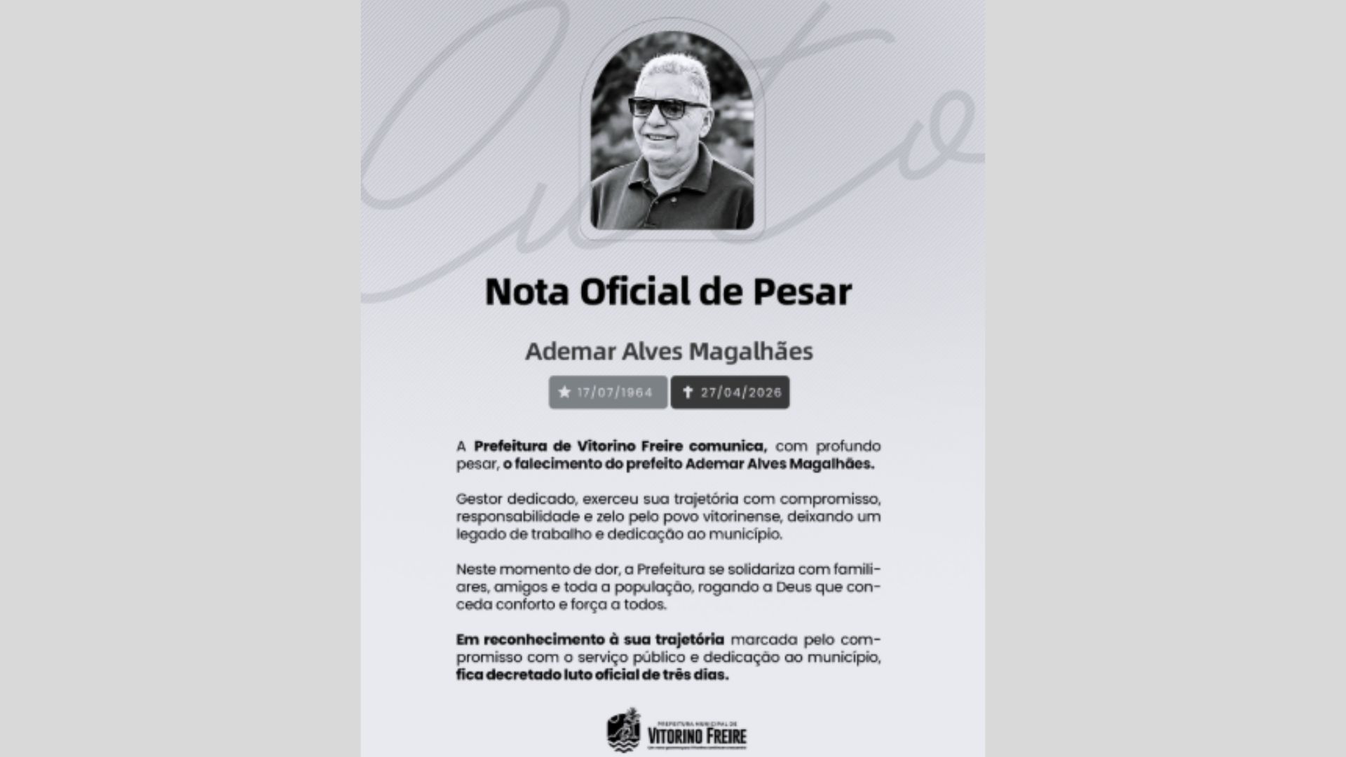 Em nota, a Prefeitura de Vitorino Freire destacou a trajetória do prefeito e decretou luto oficial de três dias no município. Ainda não há informações sobre o velório e sepultamento.